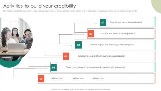 This slide demonstrates the major activities though which a company or person can develop their credibility. Activities covered are focusing on organizing, working on projects, creating connections etc.Boost your pitch with our creative Activities To Build Your Credibility Entrepreneurs Roadmap To Effective Demonstration Pdf. Deliver an awe-inspiring pitch that will mesmerize everyone. Using these presentation templates you will surely catch everyones attention. You can browse the ppts collection on our website. We have researchers who are experts at creating the right content for the templates. So you do not have to invest time in any additional work. Just grab the template now and use them. This slide demonstrates the major activities though which a company or person can develop their credibility. Activities covered are focusing on organizing, working on projects, creating connections etc.