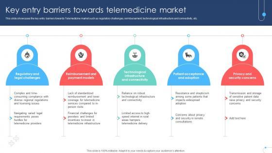 This slide showcases the key entry barriers towards Telemedicine market such as regulatory challenges, reimbursement, technological infrastructure and connectivity, etc. Crafting an eye-catching presentation has never been more straightforward. Let your presentation shine with this tasteful yet straightforward Key Entry Barriers Towards Telemedicine Market Remote Healthcare Services IR SS V template. It offers a minimalistic and classy look that is great for making a statement. The colors have been employed intelligently to add a bit of playfulness while still remaining professional. Construct the ideal Key Entry Barriers Towards Telemedicine Market Remote Healthcare Services IR SS V that effortlessly grabs the attention of your audience Begin now and be certain to wow your customers This slide showcases the key entry barriers towards Telemedicine market such as regulatory challenges, reimbursement, technological infrastructure and connectivity, etc.
