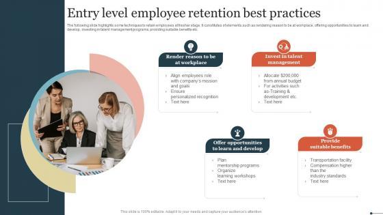 The following slide highlights some techniques to retain employees at fresher stage. It constitutes of elements such as rendering reason to be at workplace, offering opportunities to learn and develop, investing in talent management programs, providing suitable benefits etc. Pitch your topic with ease and precision using this Entry Level Employee Retention Best Practices Rules Pdf. This layout presents information on Invest Talent Management, Offer Opportunities Learn Develop, Provide Suitable Benefits. It is also available for immediate download and adjustment. So, changes can be made in the color, design, graphics or any other component to create a unique layout. The following slide highlights some techniques to retain employees at fresher stage. It constitutes of elements such as rendering reason to be at workplace, offering opportunities to learn and develop, investing in talent management programs, providing suitable benefits etc.