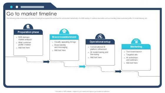 The following slide showcases a timeline showing time required for each task for successful market entry of a B2B startup. It outlines elements such as branding, ideal customer profile, AI model training, etc.Do you have an important presentation coming up Are you looking for something that will make your presentation stand out from the rest Look no further than Go To Market Timeline Ai Chatbot Service Market Entry Strategy. With our professional designs, you can trust that your presentation will pop and make delivering it a smooth process. And with Slidegeeks, you can trust that your presentation will be unique and memorable. So why wait Grab Go To Market Timeline Ai Chatbot Service Market Entry Strategy today and make your presentation stand out from the rest The following slide showcases a timeline showing time required for each task for successful market entry of a B2B startup. It outlines elements such as branding, ideal customer profile, AI model training, etc.