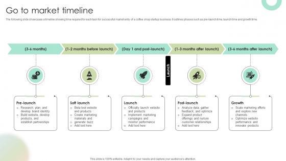 The following slide showcases a timeline showing time required for each task for successful market entry of a coffee shop startup business. It outlines phases such as pre-launch time, launch time and growth time.Presenting this PowerPoint presentation, titled Go To Market Timeline Digital Fashion Brand Portal Market Entry Plan GTM SS V, with topics curated by our researchers after extensive research. This editable presentation is available for immediate download and provides attractive features when used. Download now and captivate your audience. Presenting this Go To Market Timeline Digital Fashion Brand Portal Market Entry Plan GTM SS V. Our researchers have carefully researched and created these slides with all aspects taken into consideration. This is a completely customizable Go To Market Timeline Digital Fashion Brand Portal Market Entry Plan GTM SS V that is available for immediate downloading. Download now and make an impact on your audience. Highlight the attractive features available with our PPTs. The following slide showcases a timeline showing time required for each task for successful market entry of a coffee shop startup business. It outlines phases such as pre-launch time, launch time and growth time.