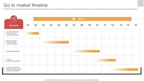 The following slide showcases a timeline showing time required for each task for successful market entry of a online fitness coaching business start-up. It outlines phases such as pre-launch time, launch time and growth time.Here you can discover an assortment of the finest PowerPoint and Google Slides templates. With these templates, you can create presentations for a variety of purposes while simultaneously providing your audience with an eye-catching visual experience. Download Go To Market Timeline Digital Physical Training Business Market Entry Plan GTM SS V to deliver an impeccable presentation. These templates will make your job of preparing presentations much quicker, yet still, maintain a high level of quality. Slidegeeks has experienced researchers who prepare these templates and write high-quality content for you. Later on, you can personalize the content by editing the Go To Market Timeline Digital Physical Training Business Market Entry Plan GTM SS V. The following slide showcases a timeline showing time required for each task for successful market entry of a online fitness coaching business start-up. It outlines phases such as pre-launch time, launch time and growth time.