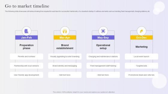 The following slide showcases a timeline showing time required for each task for successful market entry of a cleantech startup. It outlines elements such as branding, fleet management, charging stations, etc.Do you have an important presentation coming up Are you looking for something that will make your presentation stand out from the rest Look no further than Go To Market Timeline E Scooter Business Market Entry Strategy. With our professional designs, you can trust that your presentation will pop and make delivering it a smooth process. And with Slidegeeks, you can trust that your presentation will be unique and memorable. So why wait Grab Go To Market Timeline E Scooter Business Market Entry Strategy today and make your presentation stand out from the rest The following slide showcases a timeline showing time required for each task for successful market entry of a cleantech startup. It outlines elements such as branding, fleet management, charging stations, etc.