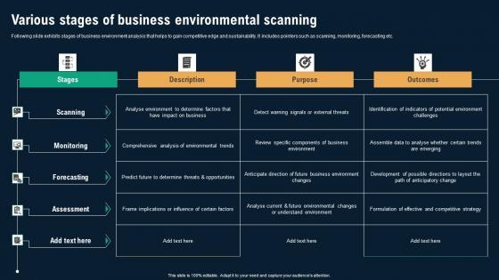 Presenting this set of slides with name types environmental scanning business ppt powerpoint presentation pictures graphics template. This is an editable Powerpoint three stages graphic that deals with topics like types environmental scanning business to help convey your message better graphically. This product is a premium product available for immediate download and is 100 percent editable in Powerpoint. Download this now and use it in your presentations to impress your audience.