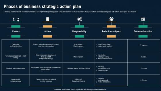 Following slide represents phases of formulating and implementing strategic plan. It includes pointers such as determine strategic position, formulate strategy etc. with action, techniques and duration. Boost your pitch with our creative Phases Of Business Strategic Action Plan Business Environmental Analysis Information Pdf Deliver an awe-inspiring pitch that will mesmerize everyone. Using these presentation templates you will surely catch everyones attention. You can browse the ppts collection on our website. We have researchers who are experts at creating the right content for the templates. So you do not have to invest time in any additional work. Just grab the template now and use them. Following slide represents phases of formulating and implementing strategic plan. It includes pointers such as determine strategic position, formulate strategy etc. with action, techniques and duration.