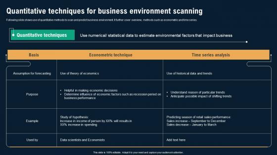 Following slide shows use of quantitative methods to scan and predict business environment. It further cover overview, methods such as econometric and time series. Slidegeeks is one of the best resources for PowerPoint templates. You can download easily and regulate Quantitative Techniques For Business Environment Business Environmental Analysis Information Pdf for your personal presentations from our wonderful collection. A few clicks is all it takes to discover and get the most relevant and appropriate templates. Use our Templates to add a unique zing and appeal to your presentation and meetings. All the slides are easy to edit and you can use them even for advertisement purposes. Following slide shows use of quantitative methods to scan and predict business environment. It further cover overview, methods such as econometric and time series.