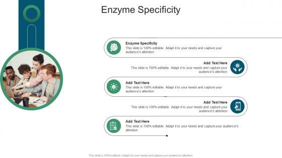 Introducing our well designed Enzyme Specificity In Powerpoint And Google Slides Cpb This PowerPoint design presents information on topics like Enzyme Specificity As it is predesigned it helps boost your confidence level. It also makes you a better presenter because of its high quality content and graphics. This PPT layout can be downloaded and used in different formats like PDF, PNG, and JPG. Not only this, it is available in both Standard Screen and Widescreen aspect ratios for your convenience. Therefore, click on the download button now to persuade and impress your audience. Our Enzyme Specificity In Powerpoint And Google Slides Cpb are topically designed to provide an attractive backdrop to any subject. Use them to look like a presentation pro.