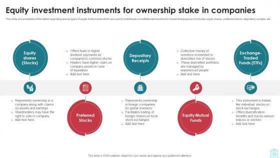 This slide shows detailed information regarding various types of equity instruments which are used by individuals or institutional investors for investment purpose. It includes equity shares, preferred stocks, depository receipts, etc. Formulating a presentation can take up a lot of effort and time, so the content and message should always be the primary focus. The visuals of the PowerPoint can enhance the presenters message, so our Equity Investment Instruments For Ownership Stake Mastering Investment Banking Fin SS V was created to help save time. Instead of worrying about the design, the presenter can concentrate on the message while our designers work on creating the ideal templates for whatever situation is needed. Slidegeeks has experts for everything from amazing designs to valuable content, we have put everything into Equity Investment Instruments For Ownership Stake Mastering Investment Banking Fin SS V This slide shows detailed information regarding various types of equity instruments which are used by individuals or institutional investors for investment purpose. It includes equity shares, preferred stocks, depository receipts, etc.