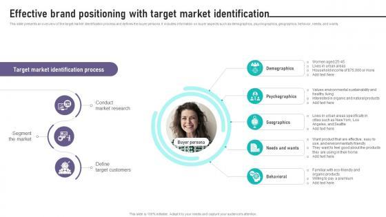 This slide presents an overview of the target market identification process and defines the buyer persona. It includes information on buyer aspects such as demographics, psychographics, geographics, behavior, needs, and wants. This Brand Equity Management To Raise Effective Brand Positioning With Target Market is perfect for any presentation, be it in front of clients or colleagues. It is a versatile and stylish solution for organizing your meetings. The Brand Equity Management To Raise Effective Brand Positioning With Target Market features a modern design for your presentation meetings. The adjustable and customizable slides provide unlimited possibilities for acing up your presentation. Slidegeeks has done all the homework before launching the product for you. So, do not wait, grab the presentation templates today This slide presents an overview of the target market identification process and defines the buyer persona. It includes information on buyer aspects such as demographics, psychographics, geographics, behavior, needs, and wants.