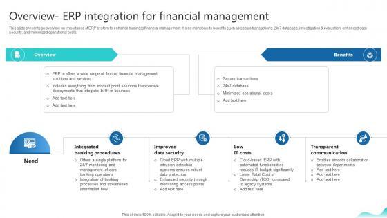 This slide presents an overview on importance of ERP system to enhance business financial management. It also mentions its benefits such as secure transactions, 24x7 database, investigation and evaluation, enhanced data security, and minimized operational costs.The Overview Erp Integration For Financial Management Erp And Digital Transformation For Maximizing DT SS V is a compilation of the most recent design trends as a series of slides. It is suitable for any subject or industry presentation, containing attractive visuals and photo spots for businesses to clearly express their messages. This template contains a variety of slides for the user to input data, such as structures to contrast two elements, bullet points, and slides for written information. Slidegeeks is prepared to create an impression. This slide presents an overview on importance of ERP system to enhance business financial management. It also mentions its benefits such as secure transactions, 24x7 database, investigation and evaluation, enhanced data security, and minimized operational costs.