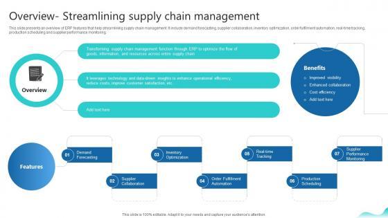 This slide presents an overview of ERP features that help streamlining supply chain management. It include demand forecasting, supplier collaboration, inventory optimization, order fulfilment automation, real-time tracking, production scheduling and supplier performance monitoring.Retrieve professionally designed Overview Streamlining Supply Chain Management Erp And Digital Transformation For Maximizing DT SS V to effectively convey your message and captivate your listeners. Save time by selecting pre-made slideshows that are appropriate for various topics, from business to educational purposes. These themes come in many different styles, from creative to corporate, and all of them are easily adjustable and can be edited quickly. Access them as PowerPoint templates or as Google Slides themes. You do not have to go on a hunt for the perfect presentation because Slidegeeks got you covered from everywhere. This slide presents an overview of ERP features that help streamlining supply chain management. It include demand forecasting, supplier collaboration, inventory optimization, order fulfilment automation, real-time tracking, production scheduling and supplier performance monitoring.