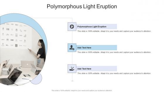 Introducing our well designed Polymorphous Light Eruption In Powerpoint And Google Slides Cpb. This PowerPoint design presents information on topics like Polymorphous Light Eruption. As it is predesigned it helps boost your confidence level. It also makes you a better presenter because of its high-quality content and graphics. This PPT layout can be downloaded and used in different formats like PDF, PNG, and JPG. Not only this, it is available in both Standard Screen and Widescreen aspect ratios for your convenience. Therefore, click on the download button now to persuade and impress your audience. Our Polymorphous Light Eruption In Powerpoint And Google Slides Cpb are topically designed to provide an attractive backdrop to any subject. Use them to look like a presentation pro.
