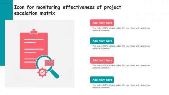 Pitch your topic with ease and precision using this Icon For Monitoring Effectiveness Of Project Escalation Matrix Diagrams pdf. This layout presents information on Icon, Monitoring Effectiveness, Project Escalation Matrix. It is also available for immediate download and adjustment. So, changes can be made in the color, design, graphics or any other component to create a unique layout. Our Icon For Monitoring Effectiveness Of Project Escalation Matrix Diagrams pdf are topically designed to provide an attractive backdrop to any subject. Use them to look like a presentation pro.
