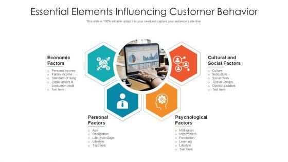 Presenting essential elements influencing customer behavior ppt gallery templates pdf to dispense important information. This template comprises four stages. It also presents valuable insights into the topics including economic factors, personal factors, psychological factors, cultural and social factors. This is a completely customizable PowerPoint theme that can be put to use immediately. So, download it and address the topic impactfully.