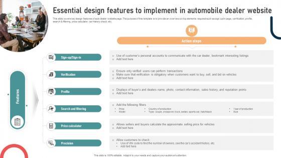 This slide covers key design features of auto dealer website page. The purpose of this template is to provide an overview on top elements required such as sign up or in page, verification, profile, search and filtering, price calculator, car history check, etc. Do you have an important presentation coming up Are you looking for something that will make your presentation stand out from the rest Look no further than Guide To Building A Successful Essential Design Features To Implement In Automobile Dealer Strategy SS V. With our professional designs, you can trust that your presentation will pop and make delivering it a smooth process. And with Slidegeeks, you can trust that your presentation will be unique and memorable. So why wait Grab Guide To Building A Successful Essential Design Features To Implement In Automobile Dealer Strategy SS V today and make your presentation stand out from the rest This slide covers key design features of auto dealer website page. The purpose of this template is to provide an overview on top elements required such as sign up or in page, verification, profile, search and filtering, price calculator, car history check, etc.