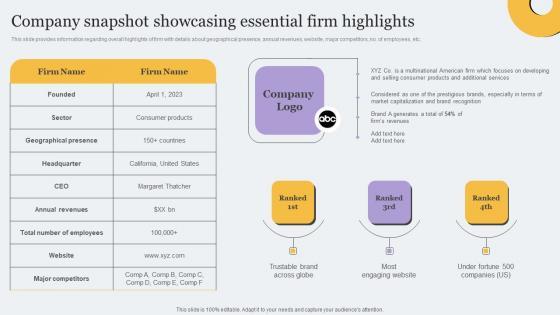 This slide provides information regarding overall highlights of firm with details about geographical presence, annual revenues, website, major competitors, no. of employees, etc. There are so many reasons you need a Strategic Toolkit For Brand Performance Enhancement Company Snapshot Showcasing Essential Firm Download PDF. The first reason is you cannot spend time making everything from scratch, Thus, Slidegeeks has made presentation templates for you too. You can easily download these templates from our website easily.