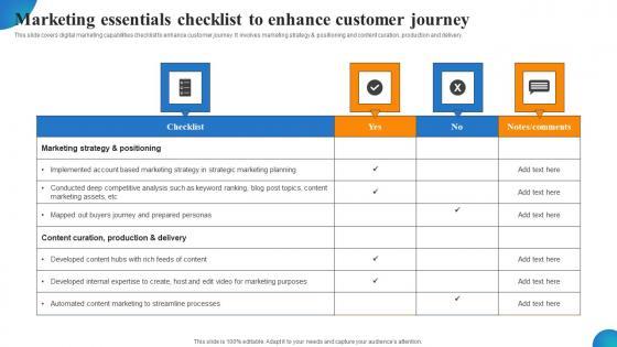 This slide covers digital marketing capabilities checklist to enhance customer journey. It involves marketing strategy AND positioning and content curation, production and delivery. Are you searching for a Marketing Essentials Checklist To Enhance Customer Journey Rules PDF that is uncluttered, straightforward, and original Its easy to edit, and you can change the colors to suit your personal or business branding. For a presentation that expresses how much effort you have put in, this template is ideal With all of its features, including tables, diagrams, statistics, and lists, its perfect for a business plan presentation. Make your ideas more appealing with these professional slides. Download Marketing Essentials Checklist To Enhance Customer Journey Rules PDF from Slidegeeks today.