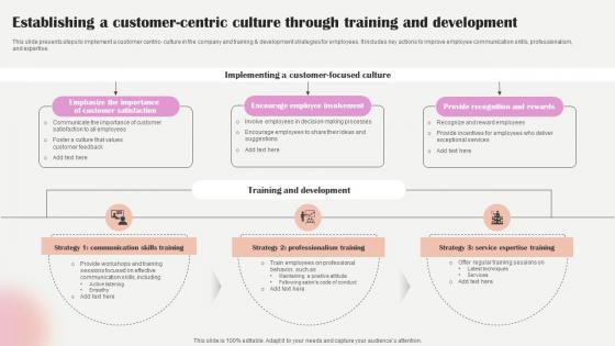 This slide presents steps to implement a customer centric- culture in the company and training and development strategies for employees. It includes key actions to improve employee communication skills, professionalism, and expertise. Welcome to our selection of the Salon Marketing Plan To Optimize Establishing A Customer Centric Culture Through Strategy SS V. These are designed to help you showcase your creativity and bring your sphere to life. Planning and Innovation are essential for any business that is just starting out. This collection contains the designs that you need for your everyday presentations. All of our PowerPoints are 100Percent editable, so you can customize them to suit your needs. This multi-purpose template can be used in various situations. Grab these presentation templates today. This slide presents steps to implement a customer centric- culture in the company and training and development strategies for employees. It includes key actions to improve employee communication skills, professionalism, and expertise.