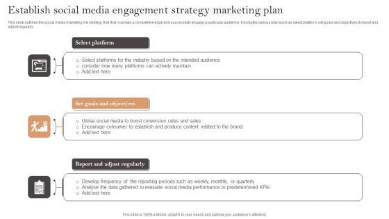 This slide outlines the social media marketing mix strategy that that maintain a competitive edge and successfully engage a particular audience. It includes various plan such as select platform, set goals and objectives and report and adjust regularly. Pitch your topic with ease and precision using this Establish Social Media Engagement Strategy Marketing Plan Ppt Outline Icons Pdf. This layout presents information on Select Platform, Set Goals, Objectives, Report, Adjust Regularly. It is also available for immediate download and adjustment. So, changes can be made in the color, design, graphics or any other component to create a unique layout. This slide outlines the social media marketing mix strategy that that maintain a competitive edge and successfully engage a particular audience. It includes various plan such as select platform, set goals and objectives and report and adjust regularly.