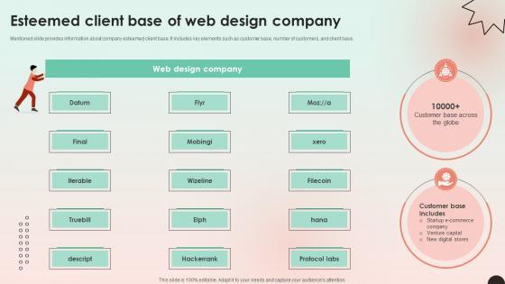 Mentioned slide provides information about company esteemed client base. It includes key elements such as customer base, number of customers, and client base. The best PPT templates are a great way to save time, energy, and resources. Slidegeeks have 100 percent editable powerpoint slides making them incredibly versatile. With these quality presentation templates, you can create a captivating and memorable presentation by combining visually appealing slides and effectively communicating your message. Download Web Consulting Business Esteemed Client Base Of Web Design Company from Slidegeeks and deliver a wonderful presentation. Mentioned slide provides information about company esteemed client base. It includes key elements such as customer base, number of customers, and client base.