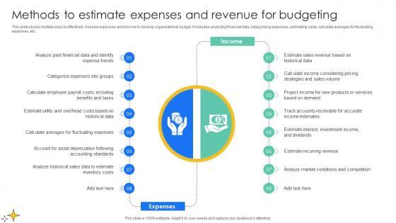 This slide shows multiple ways to effectively forecast expenses and income to develop organizational budget. It includes analysing financial data, categorizing expenses, estimating sales, calculate averages for fluctuating expenses, etc. Welcome to our selection of the Methods To Estimate Expenses And Revenue Effective And Efficient Tools To Develop Fin SS V. These are designed to help you showcase your creativity and bring your sphere to life. Planning and Innovation are essential for any business that is just starting out. This collection contains the designs that you need for your everyday presentations. All of our PowerPoints are 100Percent editable, so you can customize them to suit your needs. This multi-purpose template can be used in various situations. Grab these presentation templates today. This slide shows multiple ways to effectively forecast expenses and income to develop organizational budget. It includes analysing financial data, categorizing expenses, estimating sales, calculate averages for fluctuating expenses, etc.