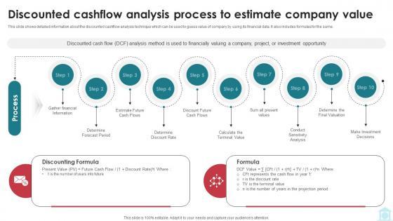 This slide shows detailed information about the discounted cashflow analysis technique which can be used to guess value of company by using its financial data. It also includes formulas for the same. Make sure to capture your audiences attention in your business displays with our gratis customizable Discounted Cashflow Analysis Process To Estimate Mastering Investment Banking Fin SS V These are great for business strategies, office conferences, capital raising or task suggestions. If you desire to acquire more customers for your tech business and ensure they stay satisfied, create your own sales presentation with these plain slides. This slide shows detailed information about the discounted cashflow analysis technique which can be used to guess value of company by using its financial data. It also includes formulas for the same.