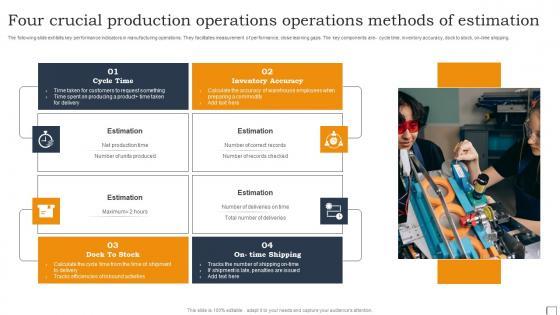 The following slide exhibits key performance indicators in manufacturing operations. They facilitates measurement of performance, close learning gaps. The key components are- cycle time, inventory accuracy, dock to stock, on-time shipping. Showcasing this set of slides titled Four Crucial Production Operations Operations Methods Of Estimation Infographics Pdf. The topics addressed in these templates are Cycle Time, Inventory Accuracy. All the content presented in this PPT design is completely editable. Download it and make adjustments in color, background, font etc. as per your unique business setting. The following slide exhibits key performance indicators in manufacturing operations. They facilitates measurement of performance, close learning gaps. The key components are- cycle time, inventory accuracy, dock to stock, on-time shipping.