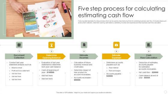 Following slide illustrates five step process which can be used by manufacturing firms for predicting business cash flow. It includes steps such as document collection, determine opening cash balance, estimating incomes and expenses and final business cash flow calculation. Pitch your topic with ease and precision using this Five Step Process For Calculating Estimating Cash Flow Rules Pdf. This layout presents information on Document Collection, Determine Opening Balance, Estimate Expenses, Cash Flow Calculation. It is also available for immediate download and adjustment. So, changes can be made in the color, design, graphics or any other component to create a unique layout. Following slide illustrates five step process which can be used by manufacturing firms for predicting business cash flow. It includes steps such as document collection, determine opening cash balance, estimating incomes and expenses and final business cash flow calculation.