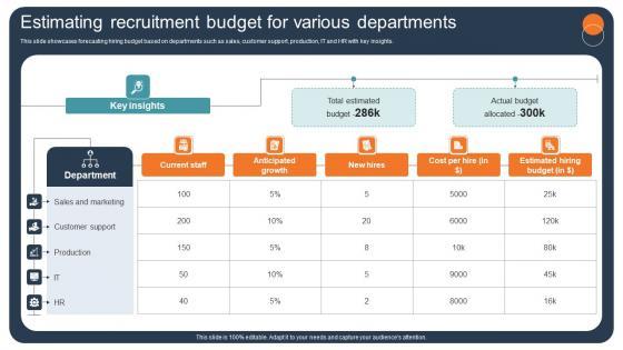 This slide showcases forecasting hiring budget based on departments such as sales, customer support, production, IT and HR with key insights. Formulating a presentation can take up a lot of effort and time, so the content and message should always be the primary focus. The visuals of the PowerPoint can enhance the presenters message, so our Transforming Recruitment Process Estimating Recruitment Budget For Various CRP DK SS was created to help save time. Instead of worrying about the design, the presenter can concentrate on the message while our designers work on creating the ideal templates for whatever situation is needed. Slidegeeks has experts for everything from amazing designs to valuable content, we have put everything into Transforming Recruitment Process Estimating Recruitment Budget For Various CRP DK SS. This slide showcases forecasting hiring budget based on departments such as sales, customer support, production, IT and HR with key insights.