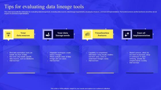 This slide represents the criteria tips for evaluating data lineage tools, including data sources, data lineage requirements, visualization features, and ease of implementation. The hosted services are the best tools since they do not require on premises implementation. Are you in need of a template that can accommodate all of your creative concepts This one is crafted professionally and can be altered to fit any style. Use it with Google Slides or PowerPoint. Include striking photographs, symbols, depictions, and other visuals. Fill, move around, or remove text boxes as desired. Test out color palettes and font mixtures. Edit and save your work, or work with colleagues. Download Business Process Data Lineage Tips For Evaluating Data Lineage Tools Themes Pdf and observe how to make your presentation outstanding. Give an impeccable presentation to your group and make your presentation unforgettable. This slide represents the criteria tips for evaluating data lineage tools, including data sources, data lineage requirements, visualization features, and ease of implementation. The hosted services are the best tools since they do not require on-premises implementation.