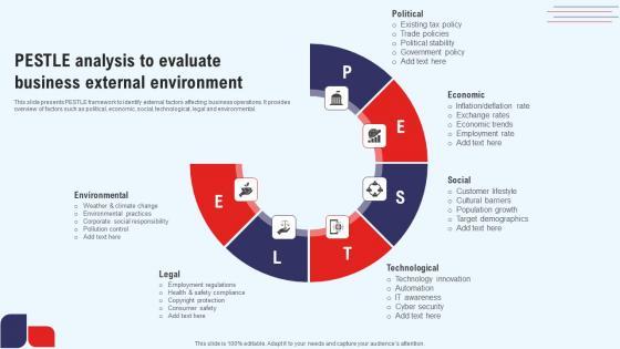 This slide presents PESTLE framework to identify external factors affecting business operations. It provides overview of factors such as political, economic, social, technological, legal and environmental. The Comprehensive Guide For Sales And Advertising Processes PESTLE Analysis To Evaluate Business External Environment Introduction PDF is a compilation of the most recent design trends as a series of slides. It is suitable for any subject or industry presentation, containing attractive visuals and photo spots for businesses to clearly express their messages. This template contains a variety of slides for the user to input data, such as structures to contrast two elements, bullet points, and slides for written information. Slidegeeks is prepared to create an impression.