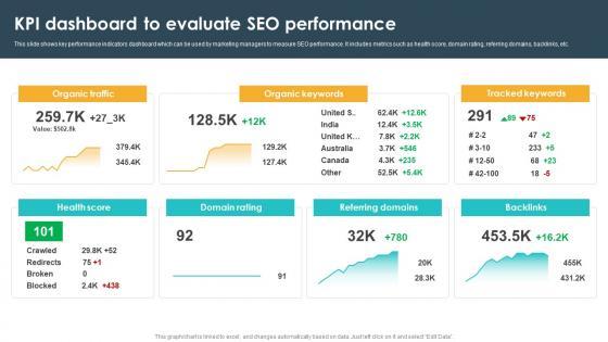 This slide shows key performance indicators dashboard which can be used by marketing managers to measure SEO performance. It includes metrics such as health score, domain rating, referring domains, backlinks, etc. Welcome to our selection of the Kpi Dashboard To Evaluate Seo Performance Seo Content Plan To Drive Strategy SS V These are designed to help you showcase your creativity and bring your sphere to life. Planning and Innovation are essential for any business that is just starting out. This collection contains the designs that you need for your everyday presentations. All of our PowerPoints are 100Percent editable, so you can customize them to suit your needs. This multi-purpose template can be used in various situations. Grab these presentation templates today. This slide shows key performance indicators dashboard which can be used by marketing managers to measure SEO performance. It includes metrics such as health score, domain rating, referring domains, backlinks, etc.