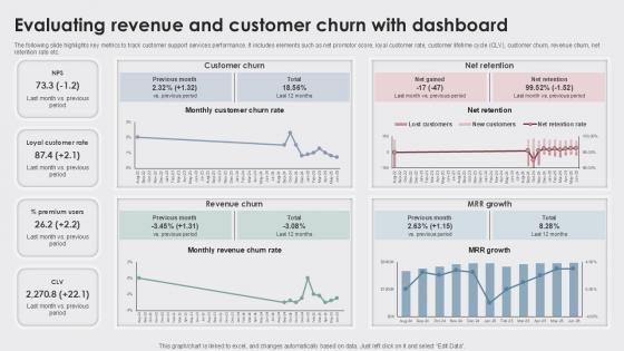 The following slide highlights key metrics to track customer support services performance. It includes elements such as net promotor score, loyal customer rate, customer lifetime cycle CLV, customer churn, revenue churn, net retention rate etc. Find highly impressive Evaluating Revenue And Customer Churn Enhancing Customer Experience Ppt Template on Slidegeeks to deliver a meaningful presentation. You can save an ample amount of time using these presentation templates. No need to worry to prepare everything from scratch because Slidegeeks experts have already done a huge research and work for you. You need to download Evaluating Revenue And Customer Churn Enhancing Customer Experience Ppt Template for your upcoming presentation. All the presentation templates are 100 percent editable and you can change the color and personalize the content accordingly. Download now The following slide highlights key metrics to track customer support services performance. It includes elements such as net promotor score, loyal customer rate, customer lifetime cycle CLV, customer churn, revenue churn, net retention rate etc.