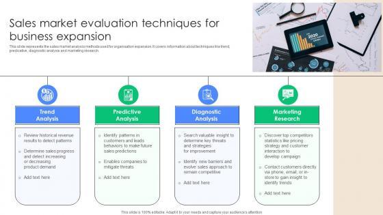 This slide represents the sales market analysis methods used for organisation expansion. It covers information about techniques like trend, predicative, diagnostic analysis and marketing research. Pitch your topic with ease and precision using this Sales Market Evaluation Techniques For Business Expansion Demonstration Pdf. This layout presents information on Trend Analysis, Predictive Analysis, Diagnostic Analysis. It is also available for immediate download and adjustment. So, changes can be made in the color, design, graphics or any other component to create a unique layout. This slide represents the sales market analysis methods used for organisation expansion. It covers information about techniques like trend, predicative, diagnostic analysis and marketing research.