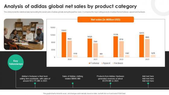 This slide provide the statistical data representing the overall sales of Adidas globally during the past four years. It compares the major selling products of Adidas that are footwear, apparel and hardware. Make sure to capture your audiences attention in your business displays with our gratis customizable Evaluating Adidas Branding Analysis Of Adidas Global Net Sales By Product Category Strategy SS V. These are great for business strategies, office conferences, capital raising or task suggestions. If you desire to acquire more customers for your tech business and ensure they stay satisfied, create your own sales presentation with these plain slides. This slide provide the statistical data representing the overall sales of Adidas globally during the past four years. It compares the major selling products of Adidas that are footwear, apparel and hardware.