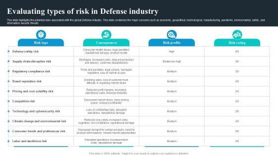 This slide highlights the potential risks associated with the global Defense industry. This slide comprises the major concerns such as economic, geopolitical, technological, manufacturing, pandemic, environmental, safety, and information security threats. Whether you have daily or monthly meetings, a brilliant presentation is necessary. Evaluating Types Of Risk In Defense Industry Global Security Industry PPT Example IR SS V can be your best option for delivering a presentation. Represent everything in detail using Evaluating Types Of Risk In Defense Industry Global Security Industry PPT Example IR SS V and make yourself stand out in meetings. The template is versatile and follows a structure that will cater to your requirements. All the templates prepared by Slidegeeks are easy to download and edit. Our research experts have taken care of the corporate themes as well. So, give it a try and see the results. This slide highlights the potential risks associated with the global Defense industry. This slide comprises the major concerns such as economic, geopolitical, technological, manufacturing, pandemic, environmental, safety, and information security threats.