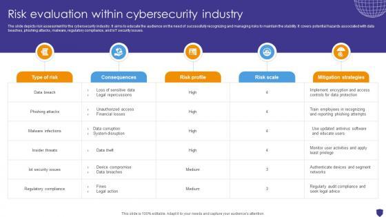 The slide depicts risk assessment for the cybersecurity industry. It aims to educate the audience on the need of successfully recognizing and managing risks to maintain the stability. It covers potential hazards associated with data beaches, phishing attacks, malware, regulatory compliance, and IoT security issues. The best PPT templates are a great way to save time, energy, and resources. Slidegeeks have 100 percent editable powerpoint slides making them incredibly versatile. With these quality presentation templates, you can create a captivating and memorable presentation by combining visually appealing slides and effectively communicating your message. Download Global Data Security Industry Report Risk Evaluation Within Cybersecurity Industry IR SS V from Slidegeeks and deliver a wonderful presentation. The slide depicts risk assessment for the cybersecurity industry. It aims to educate the audience on the need of successfully recognizing and managing risks to maintain the stability. It covers potential hazards associated with data beaches, phishing attacks, malware, regulatory compliance, and IoT security issues.