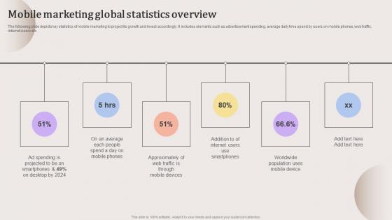 The following slide depicts key statistics of mobile marketing to project its growth and invest accordingly. It includes elements such as advertisement spending, average daily time spend by users on mobile phones, web traffic, internet users etc.If you are looking for a format to display your unique thoughts, then the professionally designed Mobile Marketing Global Statistics Overview Evaluating Strengths And Weaknesses Template Pdf is the one for you. You can use it as a Google Slides template or a PowerPoint template. Incorporate impressive visuals, symbols, images, and other charts. Modify or reorganize the text boxes as you desire. Experiment with shade schemes and font pairings. Alter, share or cooperate with other people on your work. Download Mobile Marketing Global Statistics Overview Evaluating Strengths And Weaknesses Template Pdf and find out how to give a successful presentation. Present a perfect display to your team and make your presentation unforgettable. The following slide depicts key statistics of mobile marketing to project its growth and invest accordingly. It includes elements such as advertisement spending, average daily time spend by users on mobile phones, web traffic, internet users etc.