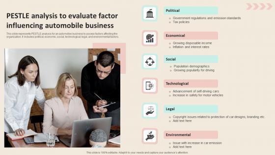 This slide represents PESTLE analysis for an automotive business to assess factors affecting the organization. It includes political, economic, social, technological, legal, and environmental factors. Find highly impressive Pestle Analysis To Evaluate Factor Influencing Automobile Business Ideas PDF on Slidegeeks to deliver a meaningful presentation. You can save an ample amount of time using these presentation templates. No need to worry to prepare everything from scratch because Slidegeeks experts have already done a huge research and work for you. You need to download Pestle Analysis To Evaluate Factor Influencing Automobile Business Ideas PDF for your upcoming presentation. All the presentation templates are 100 percent editable and you can change the color and personalize the content accordingly. Download now.
