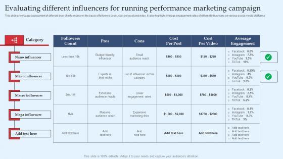 This slide showcases assessment of different type of influencers on the basis of followers count, cost per post and video. It also highlight average engagement rates of different influencers on various social media platforms. Are you in need of a template that can accommodate all of your creative concepts This one is crafted professionally and can be altered to fit any style. Use it with Google Slides or PowerPoint. Include striking photographs, symbols, depictions, and other visuals. Fill, move around, or remove text boxes as desired. Test out color palettes and font mixtures. Edit and save your work, or work with colleagues. Download Evaluating Different Influencers For Running Performance Paid Internet Marketing Strategy Slides Pdf and observe how to make your presentation outstanding. Give an impeccable presentation to your group and make your presentation unforgettable. This slide showcases assessment of different type of influencers on the basis of followers count, cost per post and video. It also highlight average engagement rates of different influencers on various social media platforms.