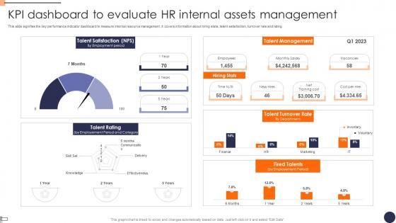 This slide signifies the key performance indicator dashboard to measure internal resource management. It covers information about hiring stats, talent satisfaction, turnover rate and rating. Showcasing this set of slides titled KPI Dashboard To Evaluate HR Internal Assets Management Structure Pdf. The topics addressed in these templates are About Hiring Stats, Talent Satisfaction, Turnover. All the content presented in this PPT design is completely editable. Download it and make adjustments in color, background, font etc. as per your unique business setting. This slide signifies the key performance indicator dashboard to measure internal resource management. It covers information about hiring stats, talent satisfaction, turnover rate and rating.