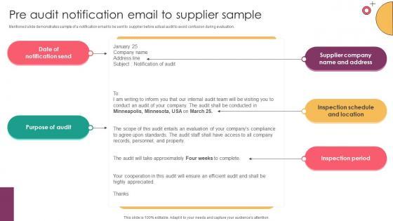 Mentioned slide demonstrates sample of a notification email to be sent to supplier before actual audit to avoid confusion during evaluation. This modern and well-arranged Strategic Supplier Evaluation Pre Audit Notification Email To Supplier Sample provides lots of creative possibilities. It is very simple to customize and edit with the Powerpoint Software. Just drag and drop your pictures into the shapes. All facets of this template can be edited with Powerpoint, no extra software is necessary. Add your own material, put your images in the places assigned for them, adjust the colors, and then you can show your slides to the world, with an animated slide included. Mentioned slide demonstrates sample of a notification email to be sent to supplier before actual audit to avoid confusion during evaluation.