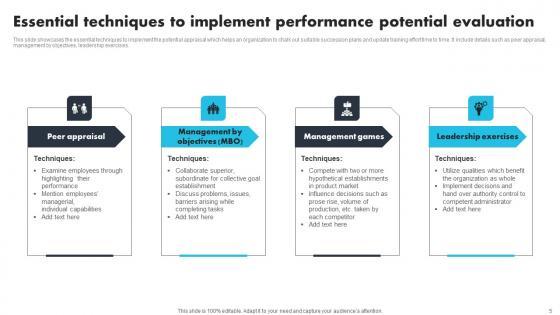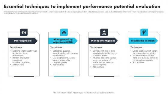 This slide showcases the essential techniques to implement the potential appraisal which helps an organization to chalk out suitable succession plans and update training effort time to time. It include details such as peer appraisal, management by objectives, leadership exercises. Showcasing this set of slides titled Essential Techniques To Implement Performance Potential Evaluation Clipart Pdf. The topics addressed in these templates are Peer Appraisal, Management Games, Leadership Exercises. All the content presented in this PPT design is completely editable. Download it and make adjustments in color, background, font etc. as per your unique business setting. This slide showcases the essential techniques to implement the potential appraisal which helps an organization to chalk out suitable succession plans and update training effort time to time. It include details such as peer appraisal, management by objectives, leadership exercises.