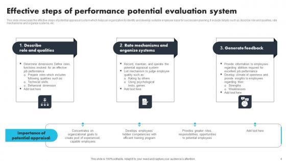 This slide showcases the effective steps of potential appraisal system which helps an organization to identify and develop suitable employee base for succession planning. It include details such as describe role and qualities, rate mechanisms and organize systems, etc. Pitch your topic with ease and precision using this Effective Steps Of Performance Potential Evaluation System Ideas Pdf. This layout presents information on Role And Qualities, Organize Systems, Generate Feedback. It is also available for immediate download and adjustment. So, changes can be made in the color, design, graphics or any other component to create a unique layout. This slide showcases the effective steps of potential appraisal system which helps an organization to identify and develop suitable employee base for succession planning. It include details such as describe role and qualities, rate mechanisms and organize systems, etc.