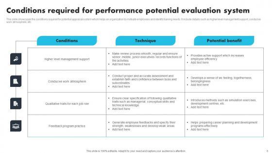 This slide showcases the conditions required for potential appraisal system which helps an organization to motivate employees and identify training needs. It include details such as higher level management support, conducive work atmosphere, etc. Showcasing this set of slides titled Conditions Required For Performance Potential Evaluation System Designs Pdf. The topics addressed in these templates are Conditions, Technique, Potential Benefit. All the content presented in this PPT design is completely editable. Download it and make adjustments in color, background, font etc. as per your unique business setting. This slide showcases the conditions required for potential appraisal system which helps an organization to motivate employees and identify training needs. It include details such as higher level management support, conducive work atmosphere, etc.