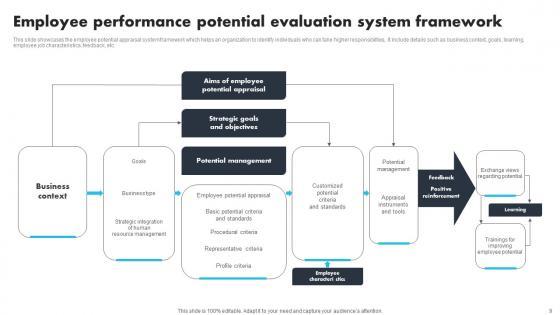 This slide showcases the employee potential appraisal system framework which helps an organization to identify individuals who can take higher responsibilties,. It include details such as business context, goals, learning, employee job characteristics, feedback, etc. Pitch your topic with ease and precision using this Employee Performance Potential Evaluation System Framework Slides Pdf. This layout presents information on Business Context, Potential Management, Learning. It is also available for immediate download and adjustment. So, changes can be made in the color, design, graphics or any other component to create a unique layout. This slide showcases the employee potential appraisal system framework which helps an organization to identify individuals who can take higher responsibilties,. It include details such as business context, goals, learning, employee job characteristics, feedback, etc.