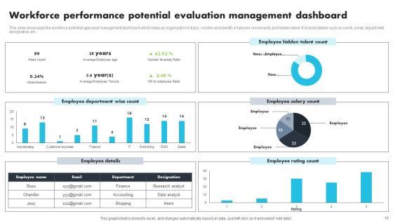 This slide showcases the workforce potential appraisal management dashboard which helps an organization to track, monitor and identify employee movements and hidden talent. It include details such as name, email, department, designation, etc. Pitch your topic with ease and precision using this Workforce Performance Potential Evaluation Management Dashboard Clipart Pdf. This layout presents information on Employee Department, Employee Salary Count. It is also available for immediate download and adjustment. So, changes can be made in the color, design, graphics or any other component to create a unique layout. This slide showcases the workforce potential appraisal management dashboard which helps an organization to track, monitor and identify employee movements and hidden talent. It include details such as name, email, department, designation, etc.