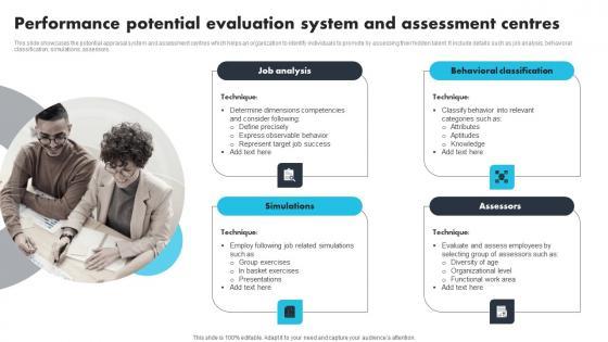 This slide showcases the potential appraisal system and assessment centres which helps an organization to identify individuals to promote by assessing their hidden talent. It include details such as job analysis, behavioral classification, simulations, assessors. Showcasing this set of slides titled Performance Potential Evaluation System And Assessment Centres Brochure Pdf. The topics addressed in these templates are Job Analysis, Simulations, Assessors. All the content presented in this PPT design is completely editable. Download it and make adjustments in color, background, font etc. as per your unique business setting. This slide showcases the potential appraisal system and assessment centres which helps an organization to identify individuals to promote by assessing their hidden talent. It include details such as job analysis, behavioral classification, simulations, assessors.