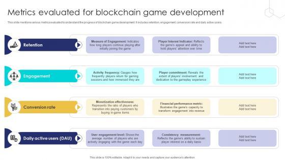 This slide mentions various metrics evaluated to understand the progress of blockchain game development. It includes retention, engagement, conversion rate and daily active users. If you are looking for a format to display your unique thoughts, then the professionally designed Unlocking The Potential Of Metrics Evaluated For Blockchain Game Development BCT SS V is the one for you. You can use it as a Google Slides template or a PowerPoint template. Incorporate impressive visuals, symbols, images, and other charts. Modify or reorganize the text boxes as you desire. Experiment with shade schemes and font pairings. Alter, share or cooperate with other people on your work. Download Unlocking The Potential Of Metrics Evaluated For Blockchain Game Development BCT SS V and find out how to give a successful presentation. Present a perfect display to your team and make your presentation unforgettable. This slide mentions various metrics evaluated to understand the progress of blockchain game development. It includes retention, engagement, conversion rate and daily active users.