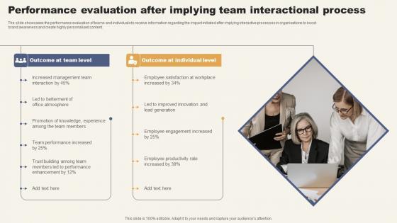 The slide showcases the performance evaluation of teams and individuals to receive information regarding the impact initiated after implying interactive processes in organisations to boost brand awareness and create highly personalised content. Pitch your topic with ease and precision using this Performance Evaluation After Implying Team Interactional Process Introduction Pdf This layout presents information on Outcome At Team Level, Outcome At Individual Level It is also available for immediate download and adjustment. So, changes can be made in the color, design, graphics or any other component to create a unique layout. The slide showcases the performance evaluation of teams and individuals to receive information regarding the impact initiated after implying interactive processes in organisations to boost brand awareness and create highly personalised content.